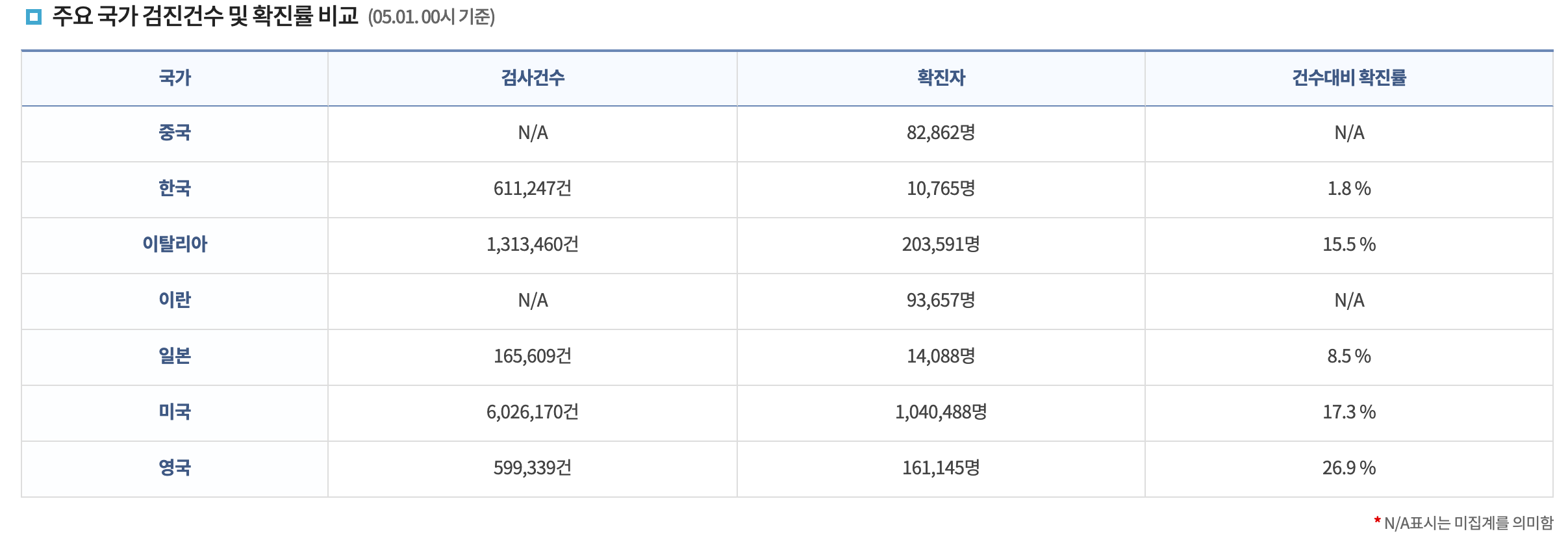 일본은 5월 1일 00시를 기준으로 검진 건수가 165,609건인데 한국은 611,247건 입니다. 우리나라 인구가 대략 5100만명이고 일본은 1.2억명 정도 입니다. 일본 인구가 우리나라 2배 정도인거죠. 그런데 검진 건수는 우리나라가 거의 4배에 달합니다. 인구가 대략 6000만명인 이탈리아는 초기 대응 실패로 인한 폭발적인 코로나 확산으로 검사 건수도 같이 늘어나 1,313,460건으로 우리나라의 2배가 넘습니다.