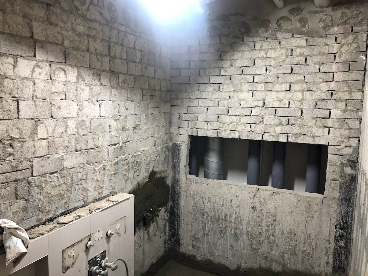 화장실은 젠다이를 만들기 위해 벽 여기저기 구멍이 나 있었습니다.