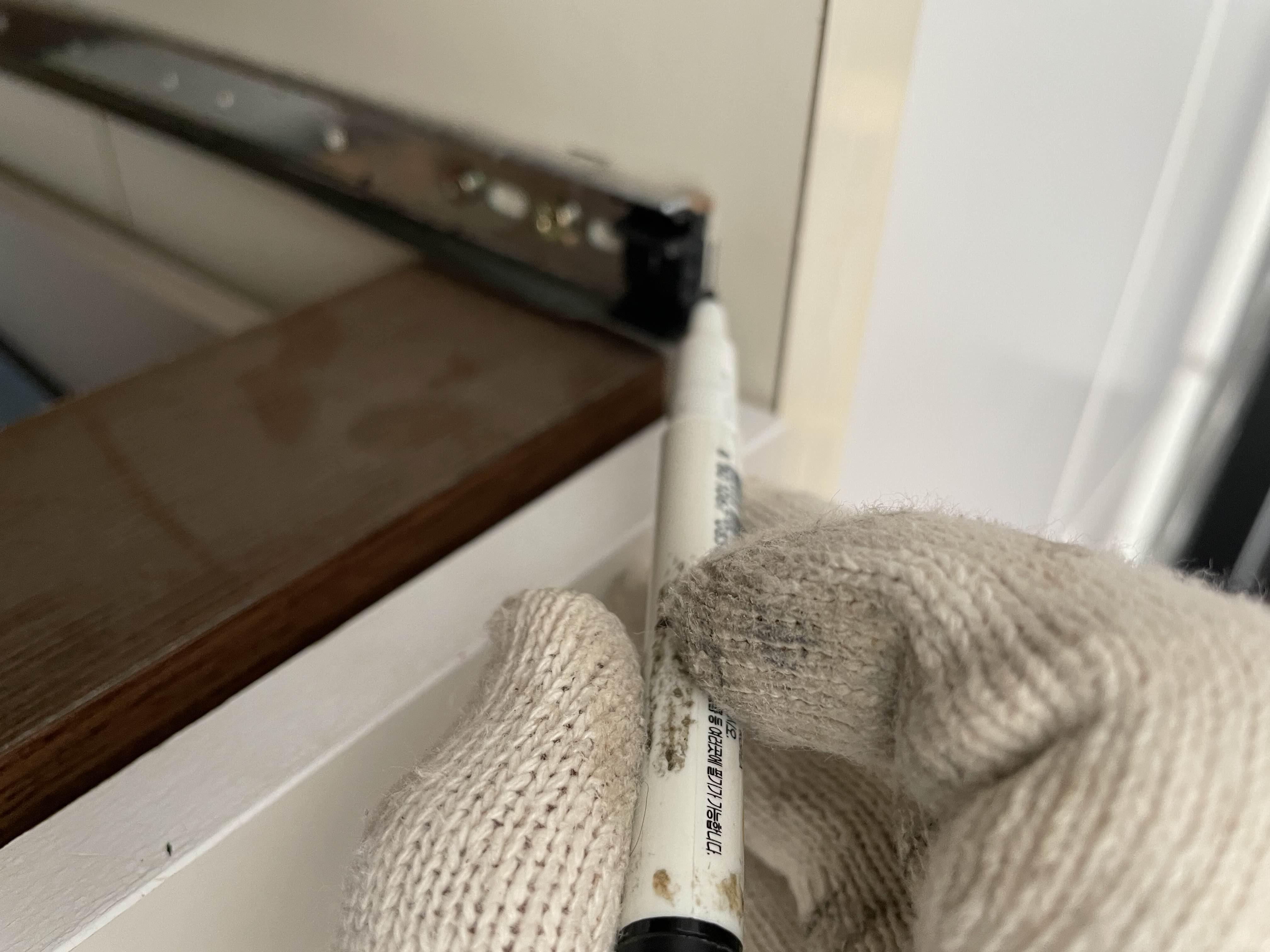 서랍을 뺐으면 기존 레일의 끝과 위아래를 마킹해줍니다. 나사로 고정한 레일을 풀고 나서 새 레일을 고정할때 원래 구멍에 맞춰서 하면 될꺼 같지만 의외로 레일을 새로 바꾸면 기존 구멍과 다르게 뚫려 일어서 구멍을 새로 뚫어야 할 경우가 너무 많습니다.