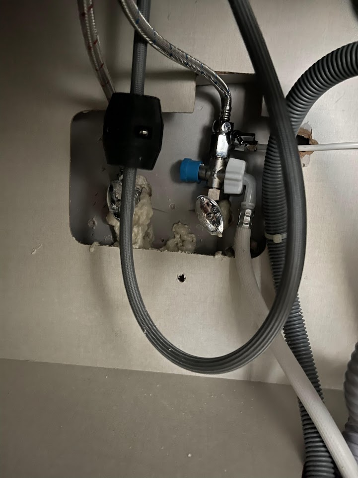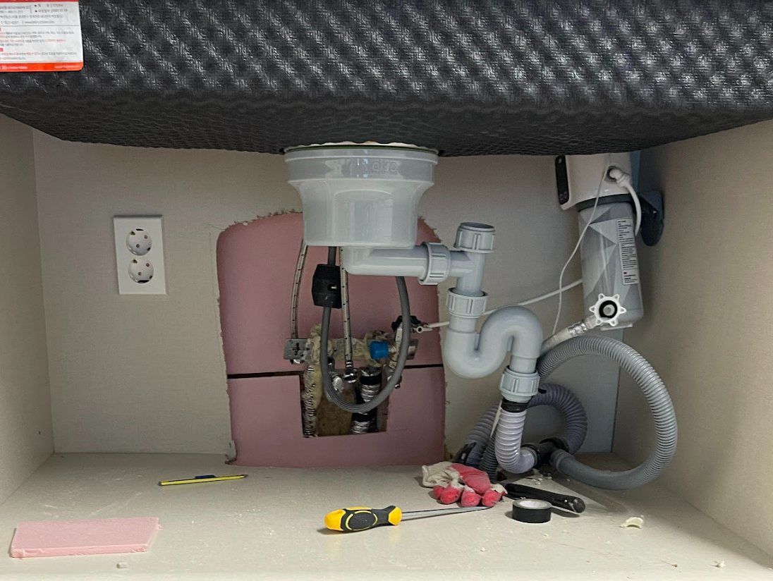 싱크대 문을 열고 드라이기로 30분 넘게 녹인 결과 물이 나오기 시작했습니다. 인테리어 업체에서는 일단 우레탄폼을 좀 더 쏴주는 간이 조치를 진행해 주셨습니다.