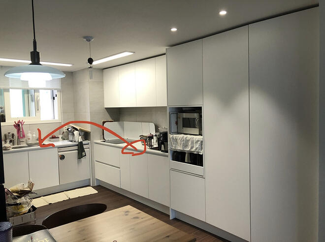 당황스러운 마음을 진정 시키고 생각이란걸 해봤습니다. 모든일에는 원인이 있는 법이니까요~ 어째서 이런 일이 생겼을까 그랬더니 아~ 이사하면서 큰맘 먹고한 인테리어 공사중에 주방 확장이 포함되어 있었다는게 생각이 났습니다.