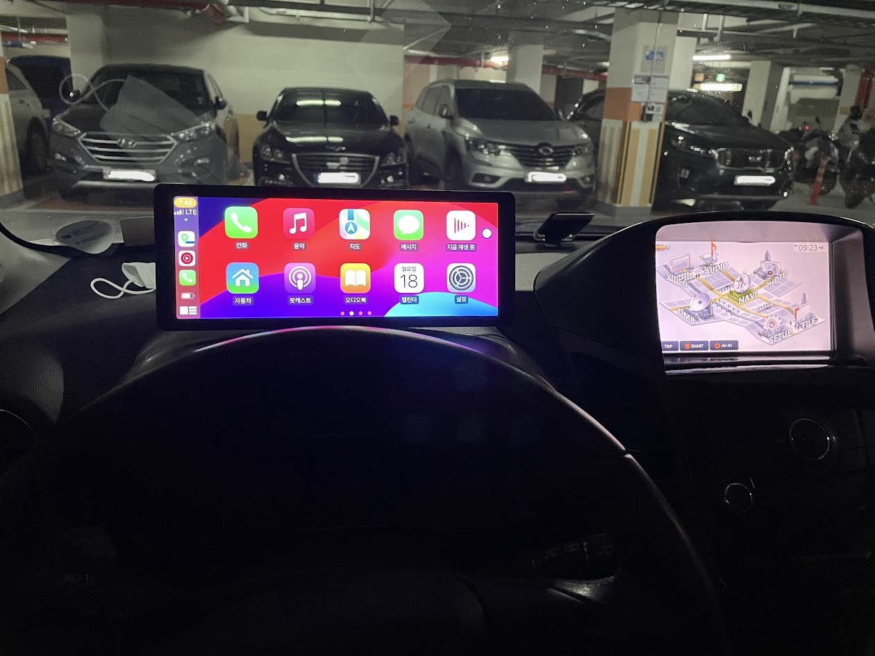 전원을 연결하니까 짜잔 모니터가 켜졌습니다. 그리고 아이폰을 블루투스로 연결 하자 카플레이가 활성화 되었습니다.