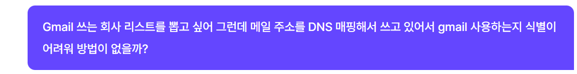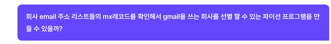 즉 회사 홈페이지 주소가 있다면 그 회사가 Gmail을 쓰는지 알아 볼 수 있는 방법이 있다는거죠. 그렇다면 홈페이지 주소로 MX레코드를 확인할 수 있도록 코딩을 할 수가 있지 않을까요?
