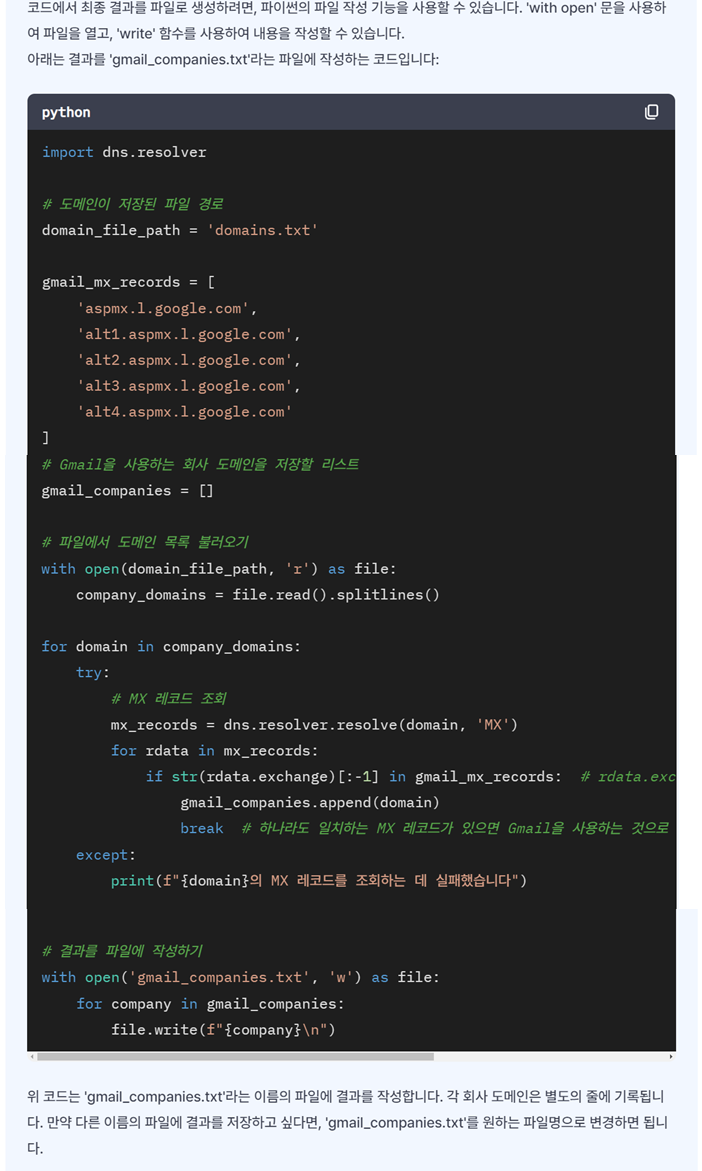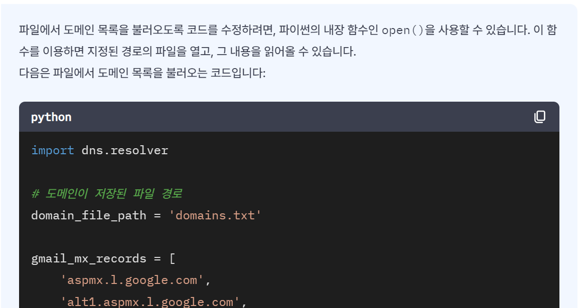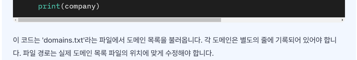 ChatGPT가 친절하게 한글로 단 주석을 보니 확인해야 하는 회사 도메인을 그냥 막 적도록 되어 있군요. 전 몇천개 도메인 리스트를 확보해서 프로그램을 돌릴껀데 이런 형태라면 곤란하죠. 그래서 도메인을 모아 놓은 파일을 읽어서 처리 하도록 변경해 달라고 요청 합니다.