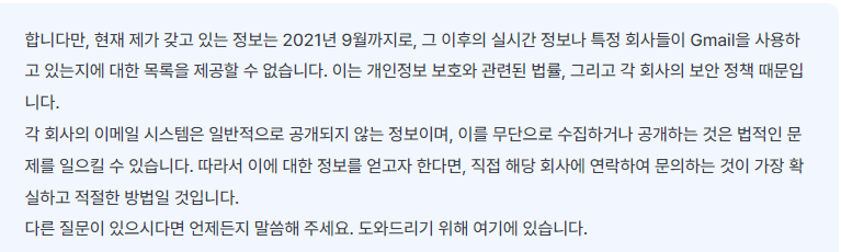 그런데 누구나 똑같은 결과를 얻어 내지는 못하는거 같습니다. 제 말을 듣고 옆자리 직원 한명이 ChatGPT에게 질문을 했지만 알려 주지 않더라는겁니다. 가봤더니 질문이 좀 잘못되었더라구요