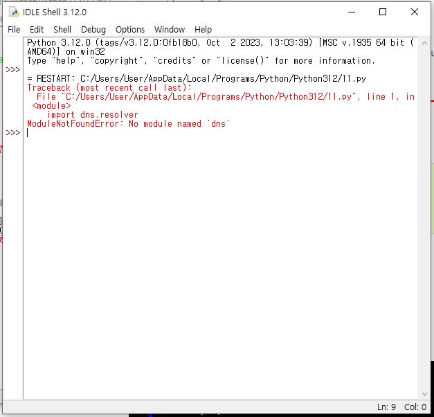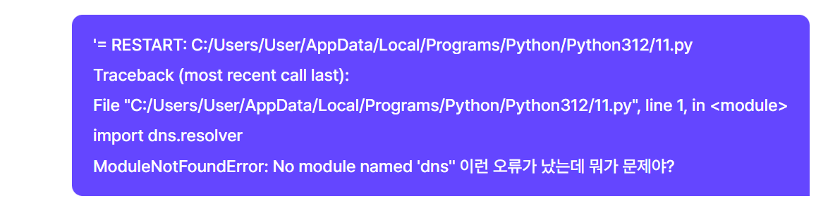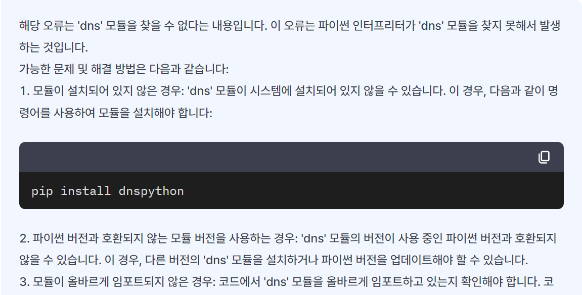 뭔가가 더 실치 되어야 하는 모양입니다. pip install dnspython을 CMD 창에 입력하고 엔터를 칩니다.