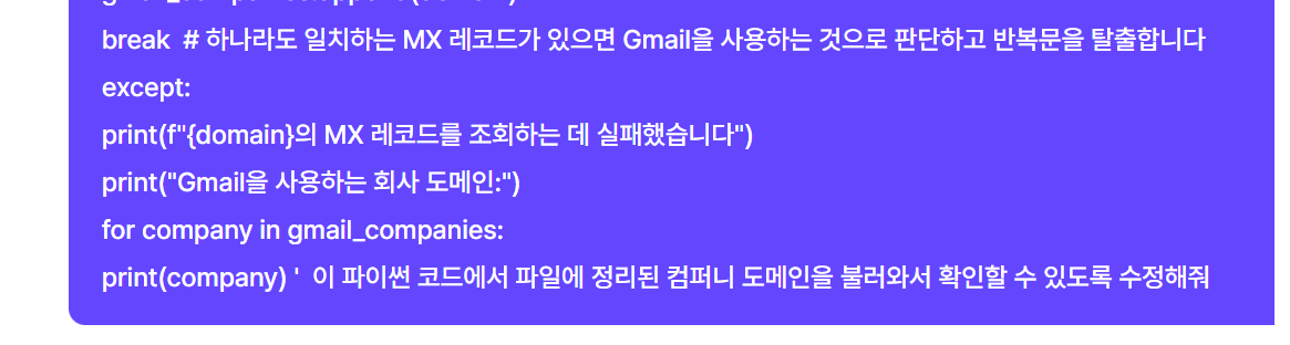 코드를 붙여 넣고는 마지막에 이 파이썬 코드에서 파일에 정리된 컴퍼니 도메인을 불러와서 확인할 수 있도록 수정해줘라고 요청했습니다. 사실 우리 회사 개발자에게도 이렇게 이야기 하면 못알아 들을때가 가끔 있습니다. 그런데 ChatGPT는 어떨가요?