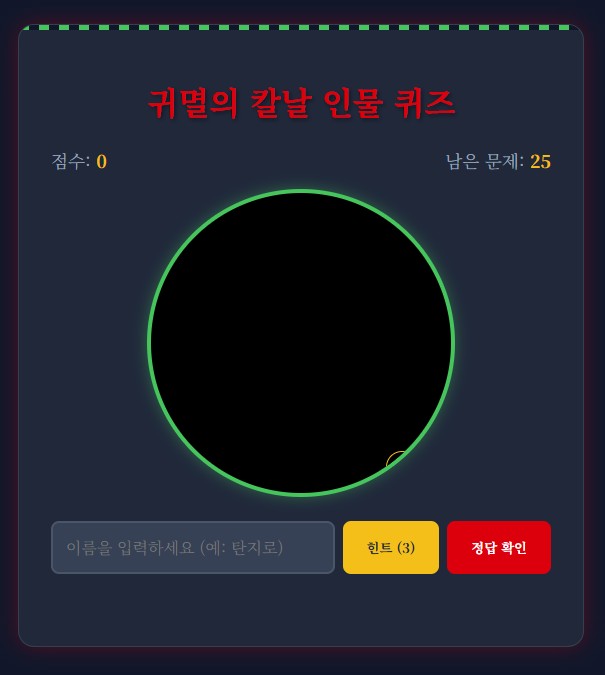 "귀멸의 칼날 인물 퀴즈 게임을 완성했습니다! d:/ai/demon_slayer_game/index.html을 열어서 플레이해보세요. 등장인물들의 이름을 맞춰보세요!"